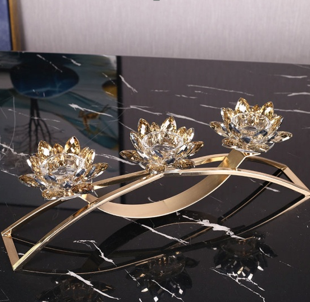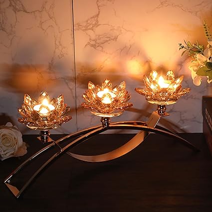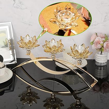 Bougeoir à 3 branches en Fleur de Lotus Cristal avec Support en Métal - Centre de Table pour Mariage et Anniversaire